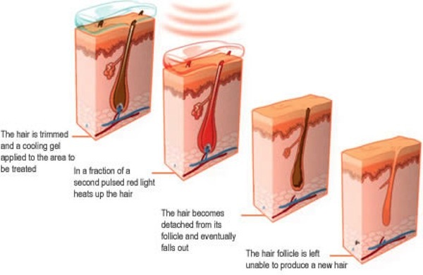 This heats up the follicle and damages it, meaning over time the hair follicle dies and the hair falls out and over the course of treatments, will not grow back.